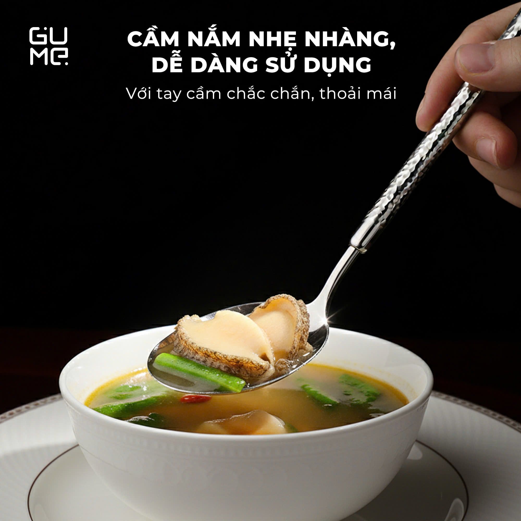 Bộ thìa GUME sở hữu thiết kế cán dài 21 cm, tạo cảm giác cầm nắm thoải mái, thuận tiện khi dùng súp, cháo, mì, tráng miệng hoặc đồ ăn nóng.